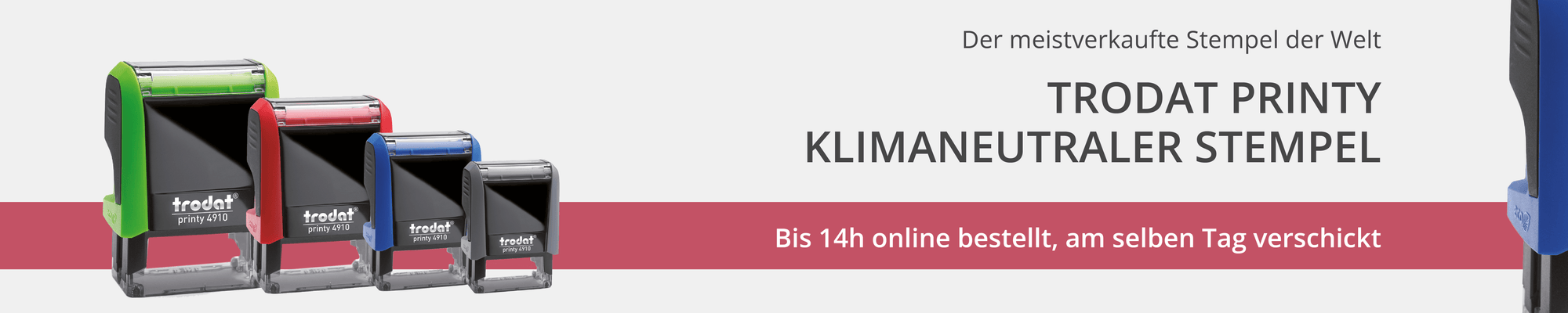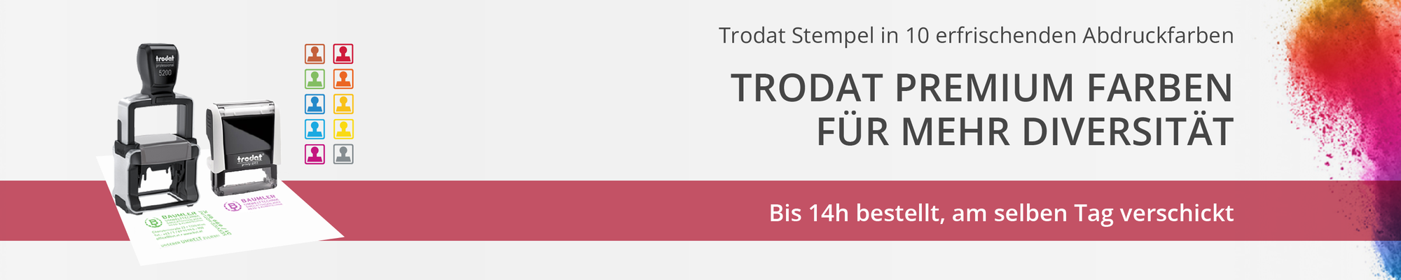Der wohl bekannteste Stempelhersteller Trodat gilt mit über 100 Millionen verkauften Stempeln als Weltmarktführer im Stempelbereich. Die innovative, in Wien gegründete Firma stellt qualitativ hochwertige Stempel für das Büro und für zu Hause her. Unser Trodat Sortiment umfasst sowohl klassische Text- und Grafikstempel als Trodat Printy, Trodat Professional wie auch Trodat Mobile Printy Modelle. Alle Trodat Printy Modelle sind in klassischen wie auch PREMIUM Abdruckfarben erhältlich.