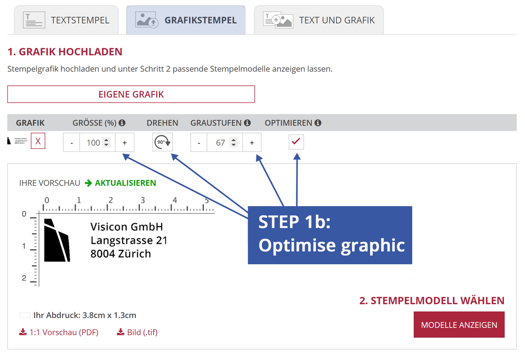 You have the possibility to download andprint a 1:1 preview as PDFat any time, so that you can view and check your stamp imprint on A4 paper in the actual imprint size.