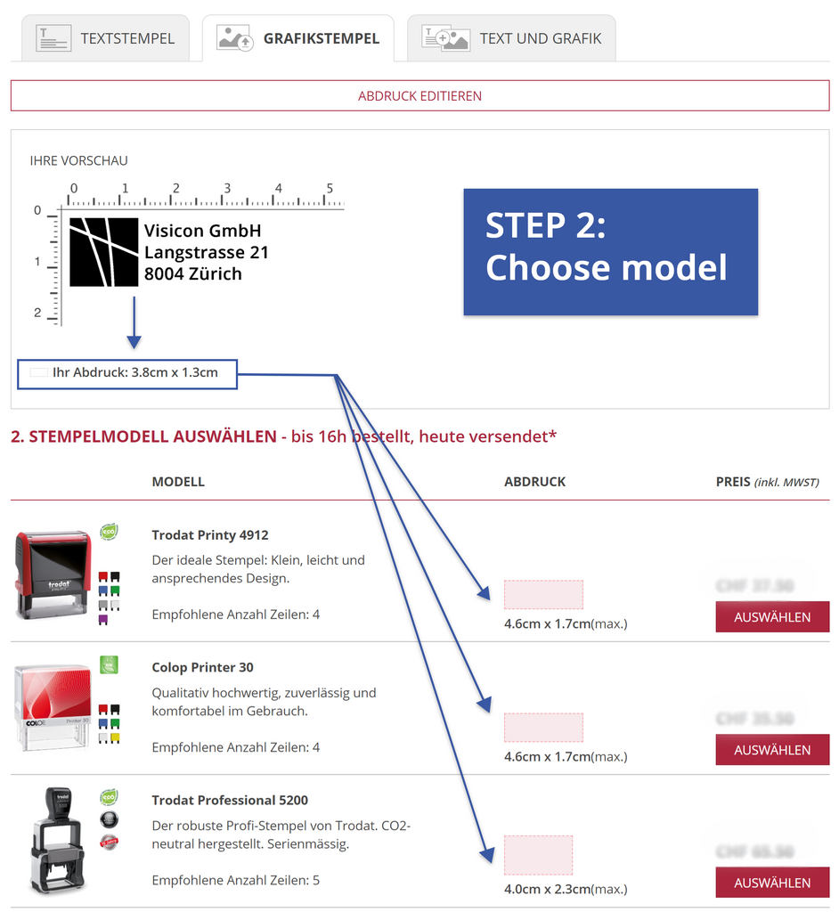 Once you have selected your desired stamp model online, you can configure your stamp model in the third and last step.